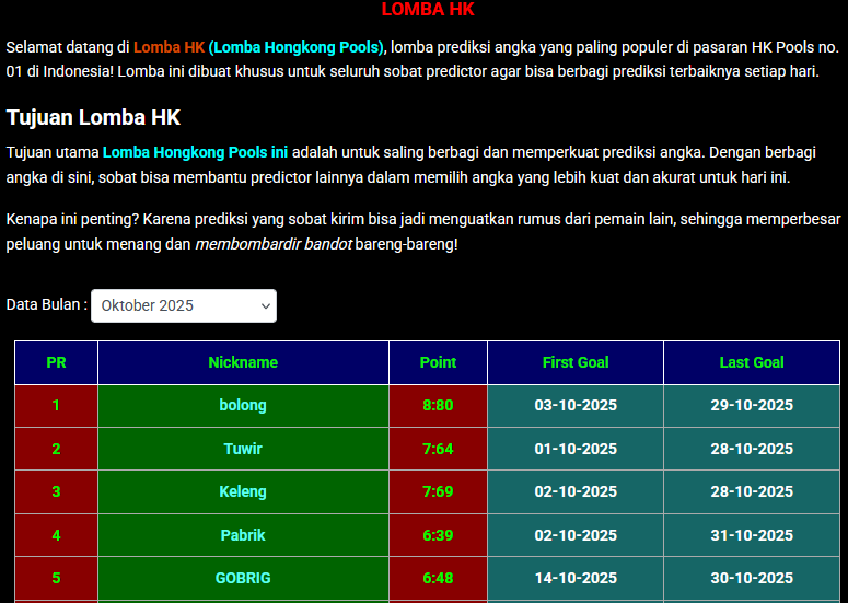 Selamat datang di Lomba HK (Lomba Hongkong Pools), lomba prediksi angka yang paling populer di pasaran HK Pools no. 01 di Indonesia! Lomba ini dibuat khusus untuk seluruh sobat predictor agar bisa berbagi prediksi terbaiknya setiap hari.